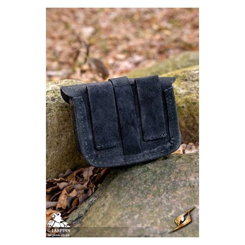 The Warrior Bag is a small suede-leather box-bag intended to hang from a belt. The bag can be closed with two sturdy leather straps secured by brass buckles. The bag is fitted with long leather straps under the lid to keep its content securely inside during combat.