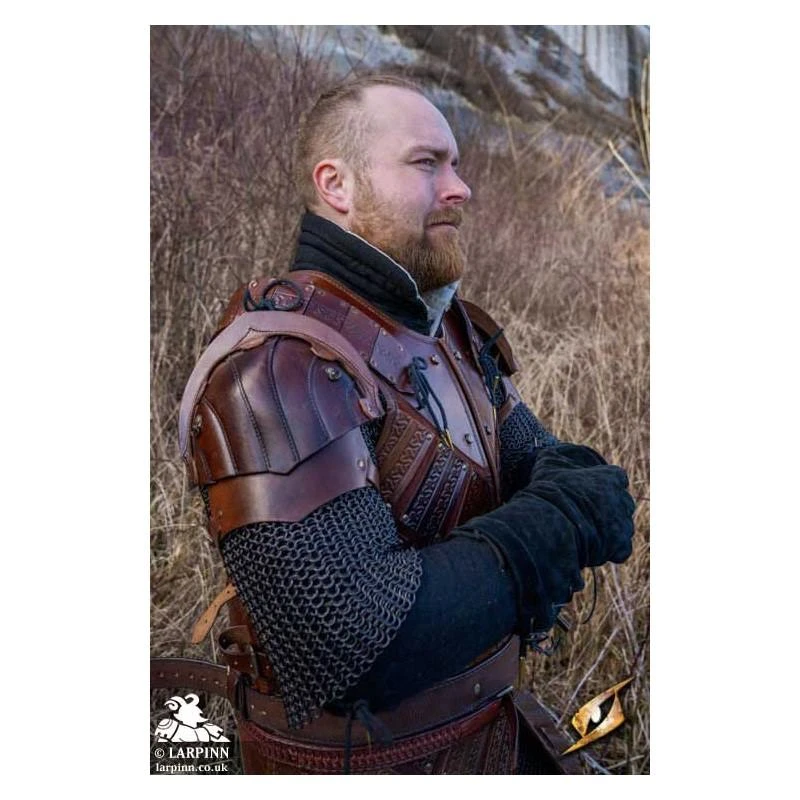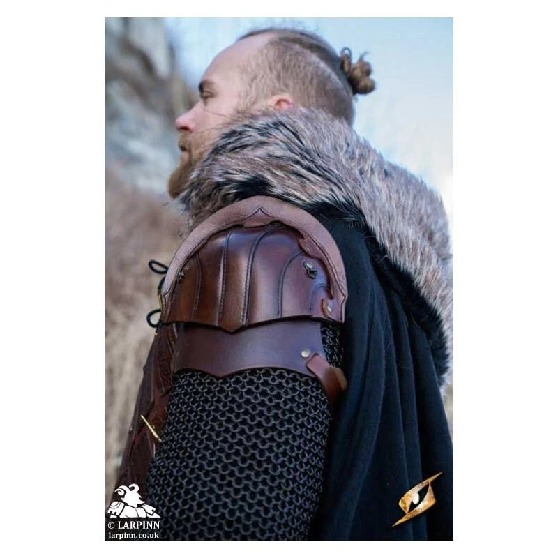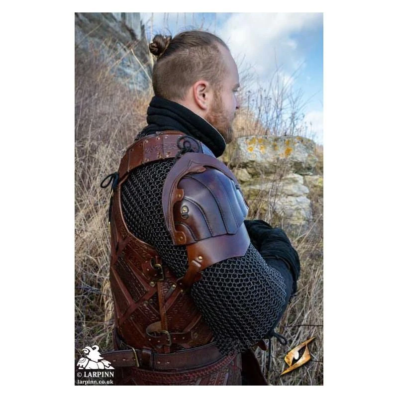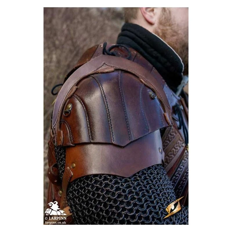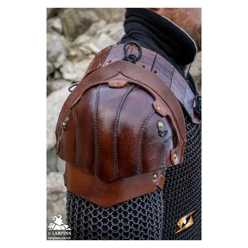 The scurrying through thick brush, it is necessary to wear the proper armor. Epic Armoury’s Brown Leather Woodsman Shoulder Set is a sleek form-fitting pauldron that will not restrict movement or get caught on loose branches. Sold as a pair, this richly detailed shoulder armour is made from several plates of stiff, vegetable-tanned leather stitched together to form a solid shell that will help defend the ranger in battle. Each pauldron can be tied to your armour using the leather strap containing riveted, segmented leather plates embossed with a beautiful Celtic pattern. The distance of the shoulder can be comfortably adjusted to fit the shoulders of just about any warrior. This spaulder-style armour is perfect for rogues and assassins who require protection but do not desire bulky or loose-fitting armour.