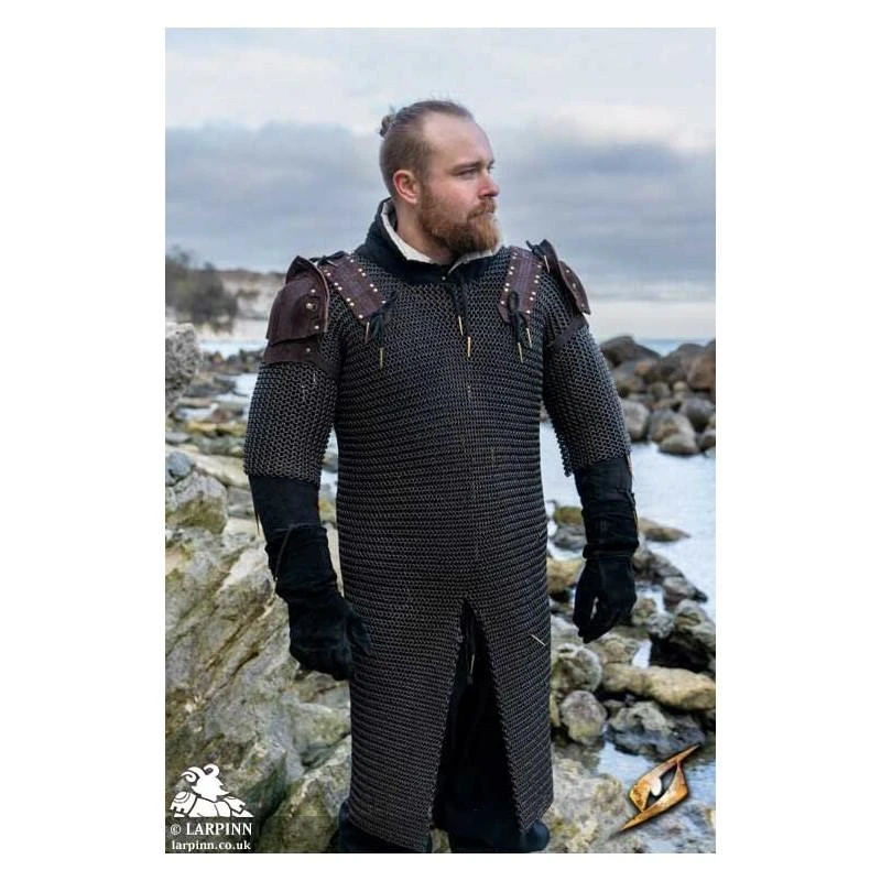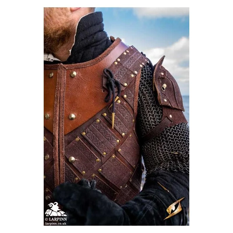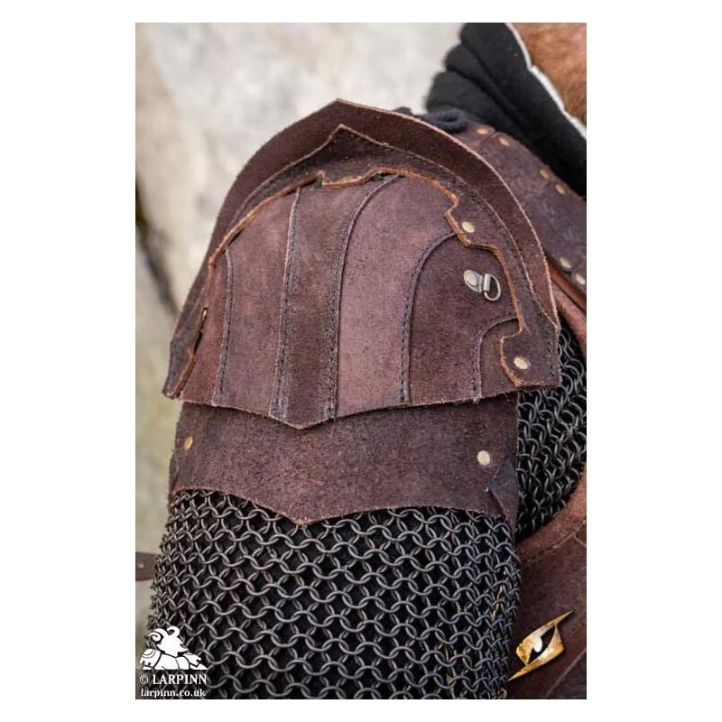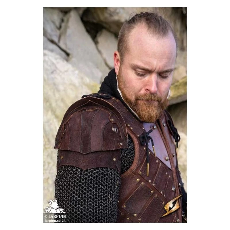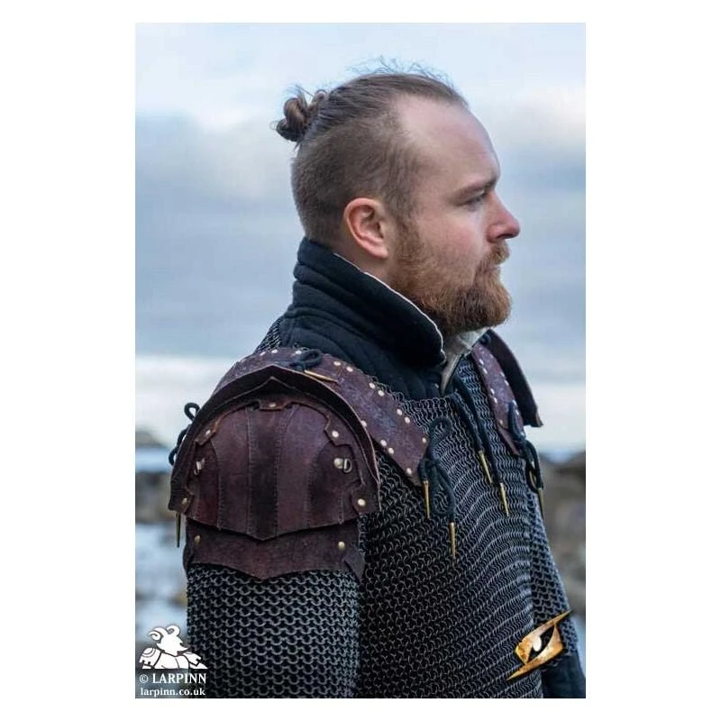 Epic Armoury’s Brown Suede Leather Woodsman Shoulder Set is the perfect way to gear up for battle. This awesome leather pauldron set is constructed from strips of chrome-tanned leather stitched together to form an impressive armour. Suede has the advantage of giving your Larp character an authentic period look with a fantasy twist. Each pauldron is equipped with a leather shoulder strap that can be fixed to any cuirass or body armor. The shoulder strap is covered in riveted plates and embossed with a lavish Celtic pattern. This snug-fitting pauldron is ideal for wanderers and warriors seeking affordable, light armour protection that will not hinder movement in battle.