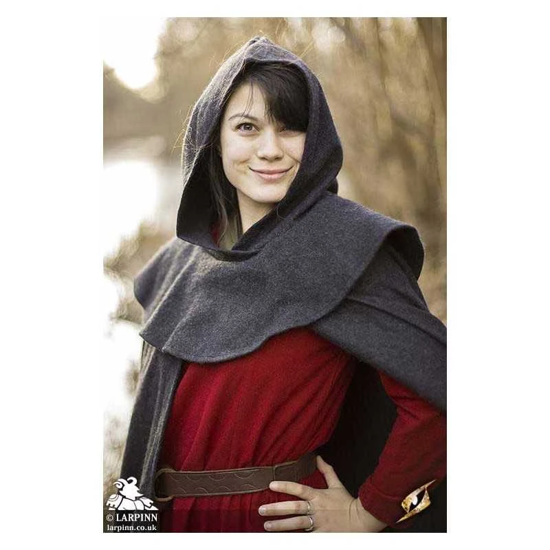 This Wool Cloak is a heavy, water-tight cloak with a hood and form-fitting shoulders beneath a mantle. The cloak protects the head down to the mid-calf from the elements, hanging naturally from the shoulders without impeding your movement. The addition of a mantle over the shoulders adds additional warmth and protection for the torso and around the cloak’s opening. Made from heavy wool blend fabric, keep warm and comfortable in snow or rain.