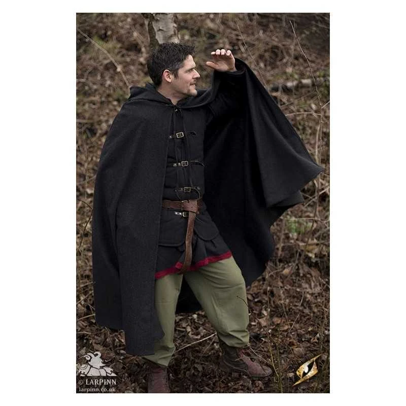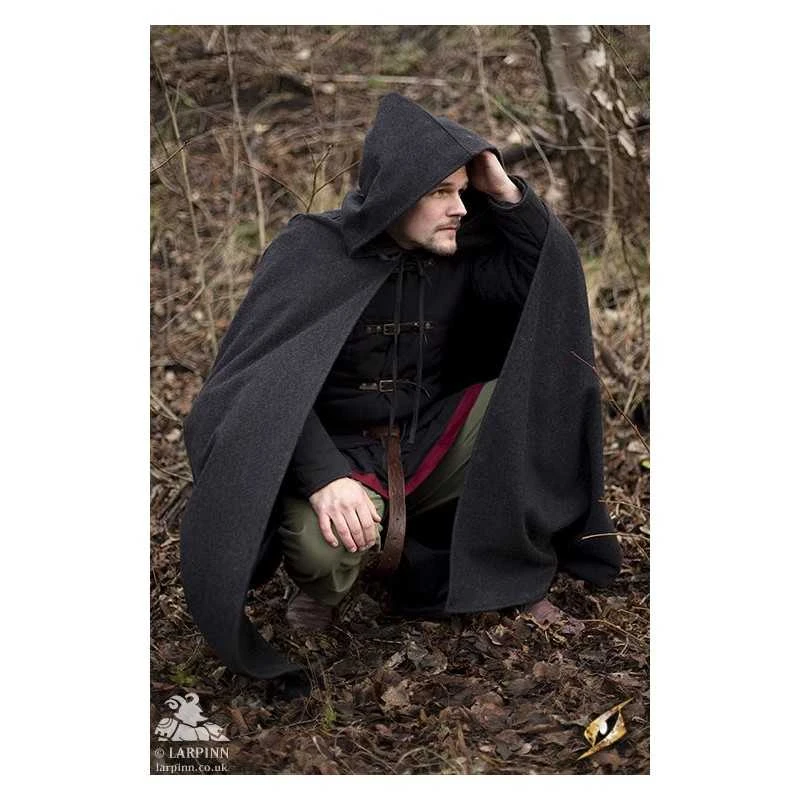 Epic Armoury’s Wool Cape is a heavy, water-tight cape with form-fitting shoulders and a deep hood. The cape protects the head down to the mid-calf from the elements, hanging naturally from the shoulders without impeding your movement. Made from heavy wool blend fabric, keep warm and comfortable in snow or rain.